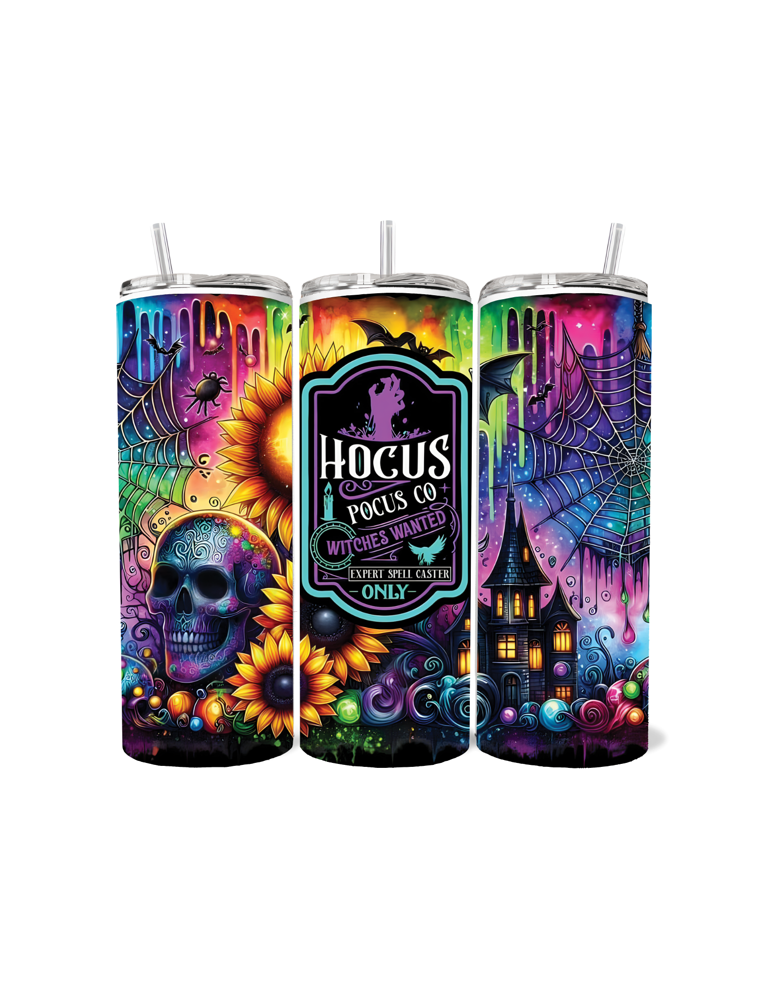 Calling all spellcasters, goth goddesses, and Halloween lovers! The Hocus Pocus Co. tumbler is a bold, bewitching 20oz drinkware masterpiece that blends spooky and vibrant artistry into one must-have piece.